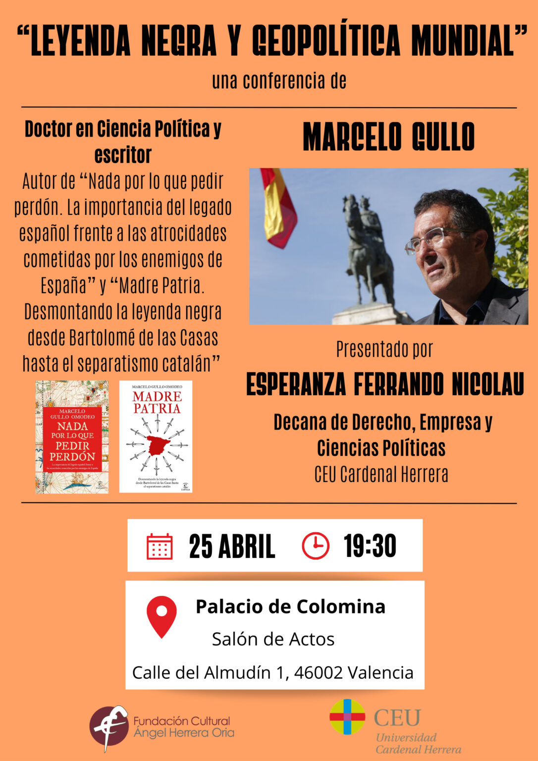 Esperanza Nicolau, decana de Derecho, Empresa y Ciencias Políticas de la UCH CEU presenta a Marcelo Gullo, doctor en Ciencia Política, divulgador histórico, escritor, experto en Relaciones Internacionales, que nos habló sobre Leyenda Negra, la importancia histórica y geopolítica de España que viene de siglos atrás, y la defensa de lo hispano y de la unión de España e Hispanoamérica, y la influencia de la cultura angolsajona en la visión global actual de España. Además, habló de distintas iniciativas surgidas en apoyo de la cultura y la herencia de España en América.