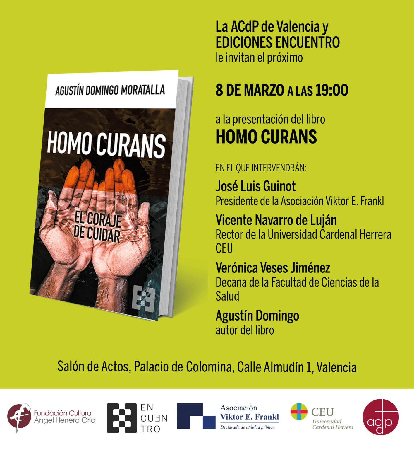 Sociedad. La Universidad CEU Cardenal Herrera acoge el acto de presentación de “Homo curans. El coraje de cuidar”, patrocinado por la Fundacion Cultural Ángel Herrera Oria, Ediciones Encuentro, la Asociación Católica de Propagandistas y la Asociación Viktor E. Frankl. Acompañaron al autor José Luis Guinot, presidente de la Asociación Viktor E. Frankl y Vicente Navarro de Luján y Verónica Veses Jiménez, de la Universidad CEU Cardenal Herrera. El autor plantea en el libro como el cuidado se ha convertido en una de las actividades definitorias de nuestra especie, como sociedades y como personas, haciendo un alegato en favor de “cuidar con toda el alma” y vinculando el cuidado con la responsabilidad.