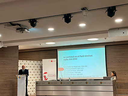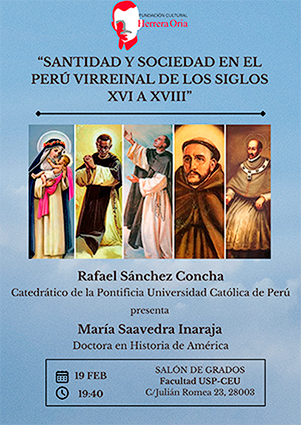 El pasado lunes 19 de febrero, la Fundación Cultural Ángel Herrera Oria tuvo el placer de recibir en las instalaciones de la Facultad de Económicas CEU San Pablo a Rafael Sánchez Concha, catedrático de la Pontificia Universidad Católica de Perú. En una magnífica lección magistral, el profesor peruano habló de los distintos santos y virtuosos del Virreinato de Perú, sus diferentes orígenes (criollos, mulatos, indígenas, hidalgos o villanos…), su relación con las instituciones, no solo eclesiásticas, sino también de poder y gobierno, siendo muchos de ellos muy cercanos a virreyes y altos funcionarios. En una sociedad elitista que diferenciaba, si bien no de iure, muchas veces de facto, entre etnias y orígenes, la santidad igualaba a todos, y estaba por encima de cualquier característica racial o social. El ponente hizo especial hincapié en figuras bien conocidas como Santa Rosa de Lima o San Martín de Porres, y aclaró que, al igual que ocurrió en la Europa latina, también el Virreinato de Perú tuvo una época de esplendor y gran concentración de santos y virtuosos, que se dio especialmente entre los años 1586 (nacimiento de Santa Rosa de Lima) y 1606 (muerte de Santo Toribio), aunque, por supuesto, se dieron perfiles antes y después. El siglo XIX es el menos estudiado en cuanto a los santos, tanto en Perú como en otros países, puesto que se dieron la Ilustración, “enemiga de la piedad popular” en palabras del propio Sánchez Concha, y el Romanticismo, que ensalzaba al “héroe” por encima del santo, desviando la atención de los poderes públicos.