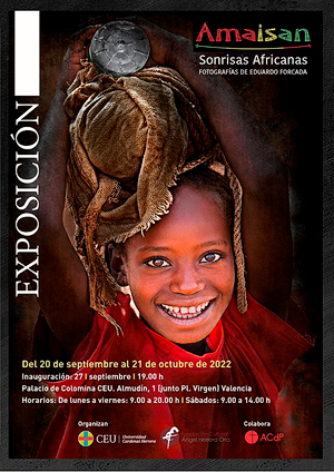 El 27 de septiembre inauguramos en el Palacio de Colomina (Universidad CEU Cardenal Herrera) la exposición solidaria “AMAISAN. Sonrisas Africanas”, cuyos beneficios recaudados irán a la Comunidad Misionera de San Pablo Apóstol, que a través de la entidad colaboradora Emalaikat, realiza proyectos para ayudar a los más necesitados. El fotógrafo, Eduardo Forcada, ha descubierto en su interior la pasión por los viajes y por la fotografía. Uniendo estas dos actividades, junto con su interés innato por conocer y profundizar en las raíces de la naturaleza humana, centra sus instantáneas en figuras africanas, coloridas, exóticas y puras. Dejándose llevar por una búsqueda vital que ansía comprender a la humanidad, Eduardo Forcada necesita asimilar experiencias, vivirlas y experimentarlas al máximo antes de transmitirlas a través de su fotografía. Es así como surgen las imágenes que contemplamos en esta exposición, procedentes del norte Kenia, sur de Etiopía y Sudán del sur, fruto de su colaboración con la Comunidad Misionera de San Pablo Apóstol. La sequía en África es uno de los mayores problemas a los que sus habitantes se enfrentan. Las lluvias son escasas durante todo el año y las altas temperaturas, cada vez más elevadas debido al cambio climático, producen niveles de evaporación muy altos, lo que deriva en un mayor peligro de incendios, destrucción de recursos naturales y gran dificultad para sacar adelante la agricultura y la ganadería, impidiendo a su vez el desarrollo social y económico de los países afectados. La falta de agua potable para uso doméstico (consumo, cocina, higiene) afecta a otro de los grandes problemas de estas poblaciones: enfermedades como el VIH, la disentería o el cólera se ven fuertemente agravadas por ello. La imagen principal que encabeza esta exposición se denomina «Niña de la tribu Ari llevando agua». En ocasiones, estos niños ven necesario recorrer hasta 10 kilómetros diarios para llevar agua a sus familias. En la lengua nyangatom, originaria de una etnia del sur de Etiopía, «amaisan» significa sonrisas. Las mismas que, con inagotable esperanza y a pesar de su pobreza, estas mujeres y niños llevan permanentemente dibujada en sus rostros. Este proyecto solidario se centra en ayudar a comunidades que sufren estos problemas. La inauguración contó con la presencia de Eduardo Forcada (fotógrafo), Agustín Domingo Moratalla (secretario del centro de la ACdP en Valencia), Elías Durán (Decano de la Facultad de Humanidades y Ciencias de la Comunicación CEU Cardenal Herrera) y Fernando Lostao Crespo (director de la Fundación Cultural Ángel Herrera Oria). El que fuera embajador de España en misión especial en el Sahel, Julio Herráiz, nos dejó un mensaje especial.