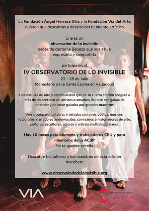 ¿En qué consiste? Una escuela de arte y espiritualidad que en su cuarta edición acogerá a más de un centenar de artistas o amantes del arte con ganas de aprender y de crear guiados por grandes maestros. Ven a compartir palabras y miradas con otros poetas, músicos, fotógrafos, narradores audiovisuales, comisarios e historiadores de arte, pintores, escultores, actores y artistas multidisciplinares. Hay 10 becas para alumnos y trabajadores CEU y para miembros de la ACdP. Organiza la Fundación Vía del Arte, fundada por Javier Viver (escultor), que cuenta con patronos de la talla de Antonio López (pintor) o Ignacio Yepes (director de Orquesta).