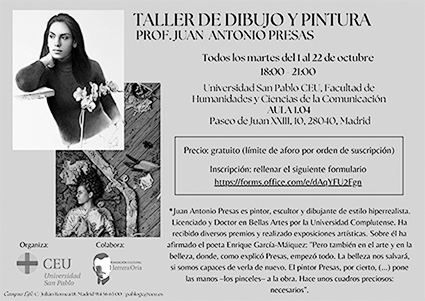 Durante este mes de octubre de 2024 ha tenido lugar el taller de Dibujo y Pintura con Juan Antonio Presas en la Facultad de Humanidades de la Universidad CEU San Pablo de Madrid. Dicho taller, organizado por Campus Life y la Fundación Cultural Ángel Herrera Oria, ha reunido a alumnos de todas las edades y niveles procedentes de la USP-CEU, en cuatro sesiones intensivas de tres horas cada una, celebrándose todos los martes del 1 al 22 de octubre. El profesor, Juan Antonio Presas, es pintor, escultor y dibujante de estilo hiperrealista; Licenciado y Doctor en Bellas Artes por la Universidad Complutense, y ha recibido diversos premios y realizado exposiciones artísticas.