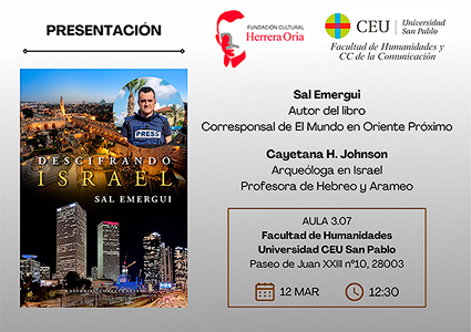 El pasado martes 12 de marzo, la Fundación Cultural Ángel Herrera Oria, en colaboración con la Facultad de Humanidades y Ciencias de la Comunicación de la Universidad CEU San Pablo, tuvo el placer de recibir a Sal Emergui, corresponsal del diario El Mundo en Israel, donde vive desde hace más de dos décadas. El periodista presentó su último libro “Descifrando Israel” de la editorial Confluencias, siendo introducido el acto por  Cayetana H. Johnson, arqueóloga en Tierra Santa y profesora de Hebreo y Arameo, entre otras, en la Universidad Eclesiástica San Dámaso. Alumnos y profesores pudieron conocer algo más sobre la larga y compleja historia de Israel, su pueblo y Estado, y su muy particular situación geopolítica gracias a esta presentación